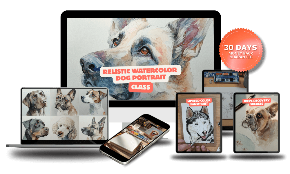 Turn a photo of your dog into a realistic watercolor portrait. Finish in one weekend or at your own pace. Even if you've never painted before.